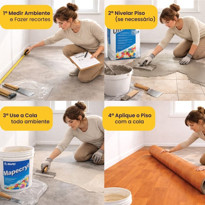 Os pisos vinílicos em manta não são autocolante e precisam ser instalados com cola de contato, como a Mapecryl Eco. Existem opções de piso vinílico autocolante disponíveis em nosso site.